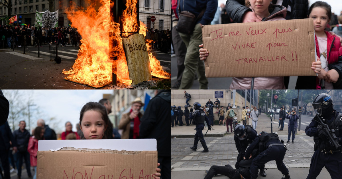 Încă o zi de proteste în Franța: între 500.000 și un milion de francezi au protesta luni, 1 mai, după aproape 4 luni de frământări sociale ieșite din comun, provocate de reforma pensiilor. Protestele au devenit violente la Paris și Nantes. Un polițist a fost grav rănit în Paris, după ce asupra lui s-a aruncat cu un cocktail Molotov. De asemenea, protestatarii din Strasbourg au ars un manechin cu chipul președintelui Emmanuel Macron. Noi proteste violente în Franța FOTO: Profimed...